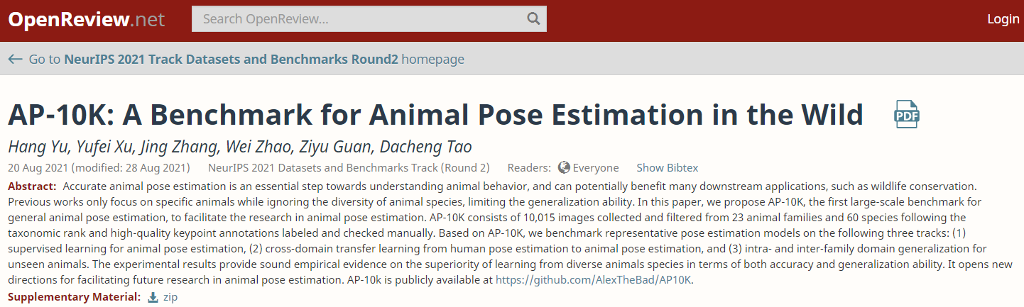 近日,赵伟教授指导的博士生喻航撰写的论文“AP-10K: ABenchmark for Animal Pose Estimation in the Wild”被2021年度神经信息处理系统大会(Thirty-fifth Conference on Neural Information Processing Systems,简称NeurIPS)接收。该论文提出了第一个为普遍的动物姿态估计提供基准的大规模动物姿态数据集AP-10K。在该数据集的基础上,论文从三个方面进行了姿态估计的实验,实验结果表明:姿态估计模型从多个不同物种中进行学习,能够带来准确性和泛化性的巨大优势,该论文的实验数据为此提供了可靠的经验证据,AP-10K为促进动物姿势估计的未来研究开辟了新的方向。