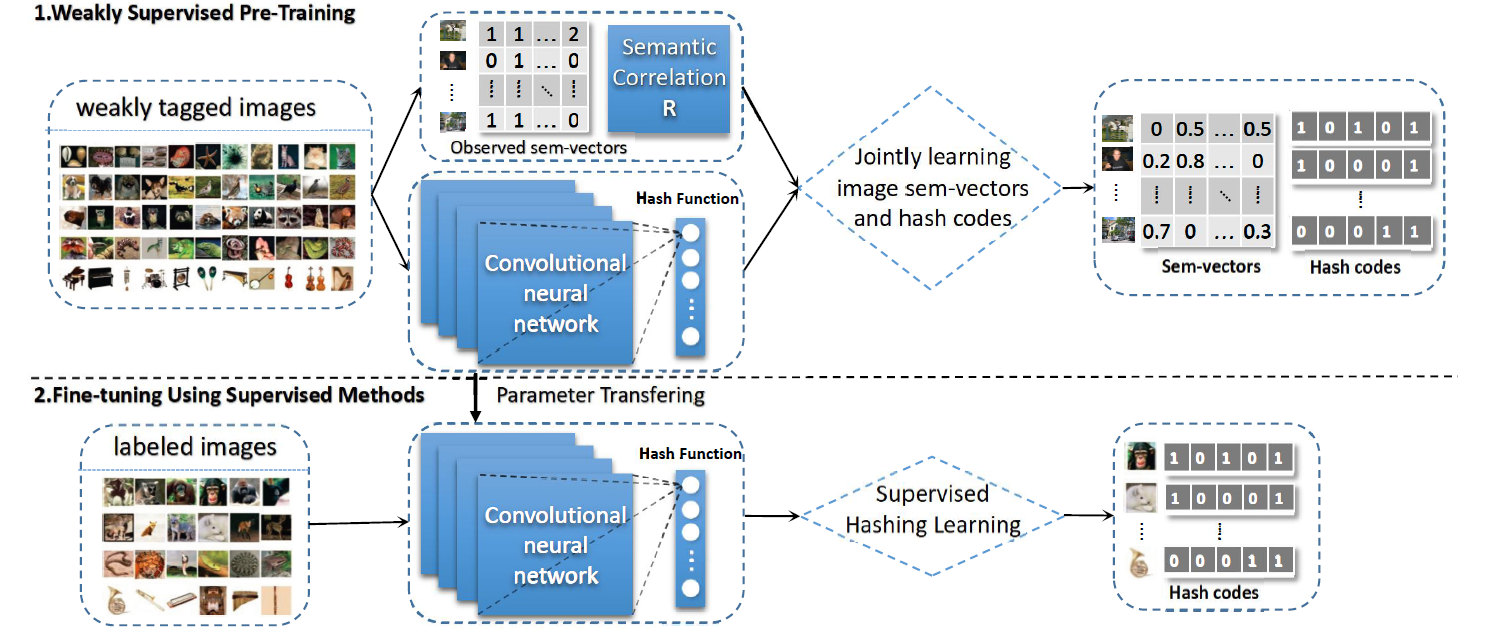 赵伟教授在IEEE TPAMI(CCF A类,IF=16.389)发表的论文“TelecomNet: Tag-based Weakly-supervised Modally Cooperative Hashing Network for Image Retrieval”,提出了基于社会媒体用户弱标注数据的图像检索方法。该方法借助于社会媒体上用户提供的文本标签中的语义信息,学习图像哈希函数。不同于先前的无监督或有监督哈希算法,该方法包含了弱监督预训练,以及监督精调两个步骤。实验证明,该方法可以有效提升现有监督哈希算法的性能。