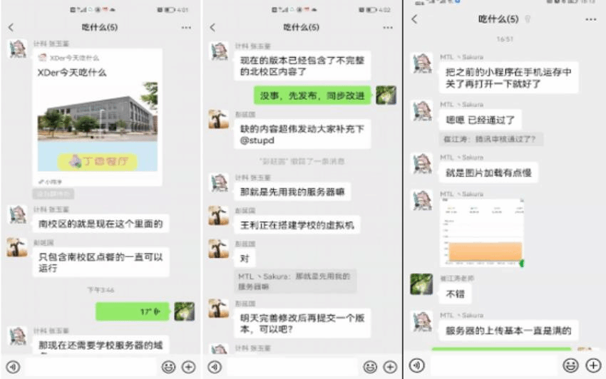 针对小程序运行之初,访问带宽受限、并行处理能力弱、小程序发布审核时间久等问题,365best体育官网登录崔江涛教授、彭延国副教授带领研究生一起帮助张玉鉴加班加点提供解决方案,设计了支持高并发的部署方案,统筹协调计算中心开辟了专用虚拟服务器资源,争分夺秒完成了应用迁移,同时联系腾讯公司加速小程序审核,确保了“XDer今天吃什么”小程序及时发布。目前云选餐服务可以正常使用,后续将根据同学们的建议进一步完善相关功能。