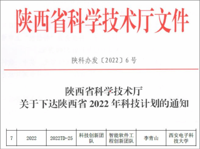 (通讯员 徐悦甡)近日,陕西省科技厅正式下发《陕西省科学技术厅关于下达陕西省2022年科技计划的通知》,其中公布了2022年陕西省科技创新团队计划名单,由365best体育官网登录(国家特色化示范性软件公司)党委书记、软件工程学科负责人、西安市智能软件工程重点实验室主任李青山教授负责的智能软件工程创新团队成功入选。