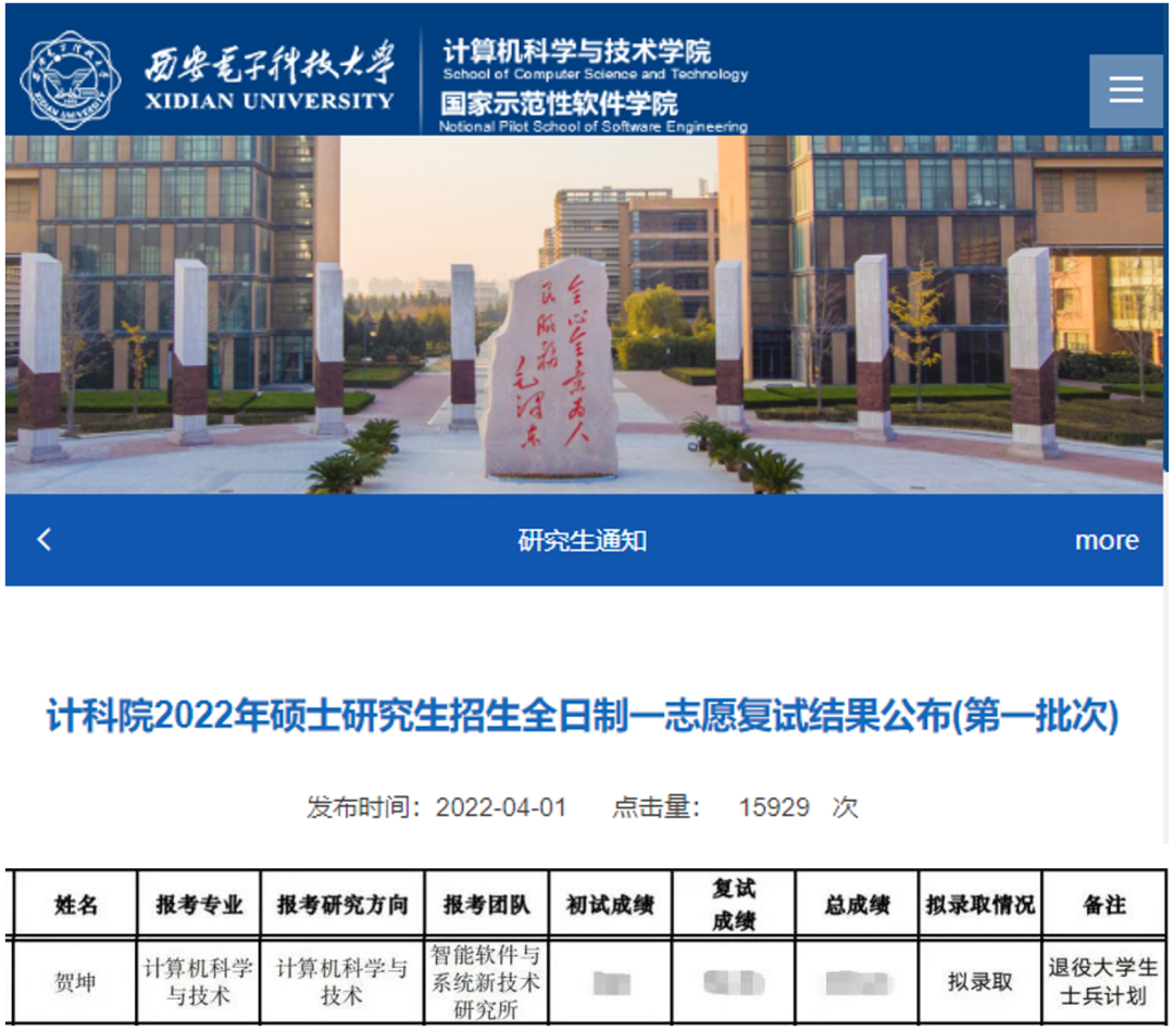 (图文来源365亚洲体育网入口新闻网)人间最美四月天,在西电退伍老员工士兵群体里传来好消息,贺坤同学通过“硕士研究生招生退役士兵专项计划”被365best体育官网登录拟录取。