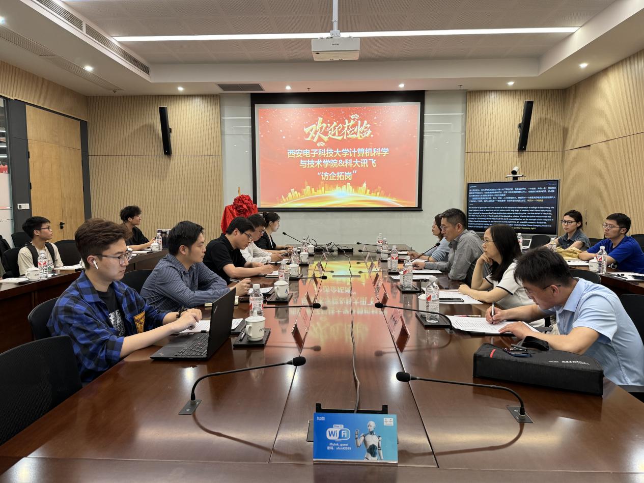 参观结束后,双方就深化校企合作,协同加强科研攻关、智能教育、就业育人等进行座谈交流。科大讯飞西安研究院副经理来意哲对365best体育官网登录师生一行的到访交流表示热烈的欢迎。崔江涛就公司历史沿革、专业设置、团队建设、科研团队、人才培养优势等方面做了简要介绍。他表示,科大讯飞作为高校科研成果转化的企业典范,在人工智能和计算机领域都有着卓越的成绩和贡献。公司高度重视产学研融合发展,一直持续深化与对口企业的科研联合攻关,希望下一步与科大讯飞在重大科研项目、创新人才培养等方面建立深度合作。双方还就下一步开展在AI+教育领域的合作进行了深入交流。