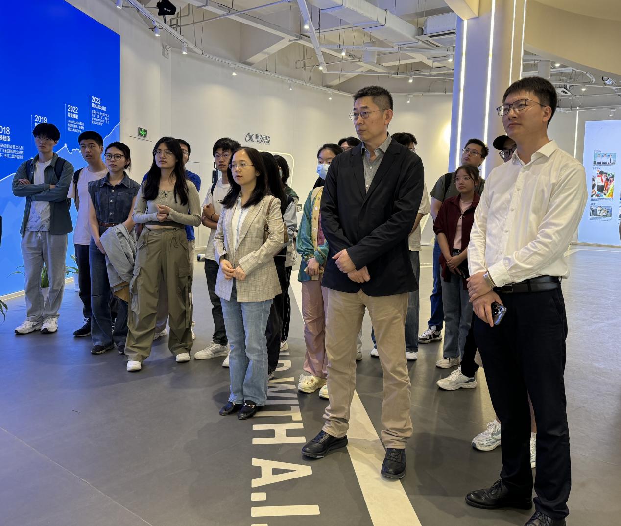公司师生一行参观了科大讯飞AI+科技园区展厅,在工作人员的带领和解说下,公司师生进一步了解了科大讯飞在语音识别领域以及在AI+教育、医疗、城市、工业、产教融合、智能服务和企业数字化等方面的成果及应用,观看了讯飞星火认知大模型功能演示。