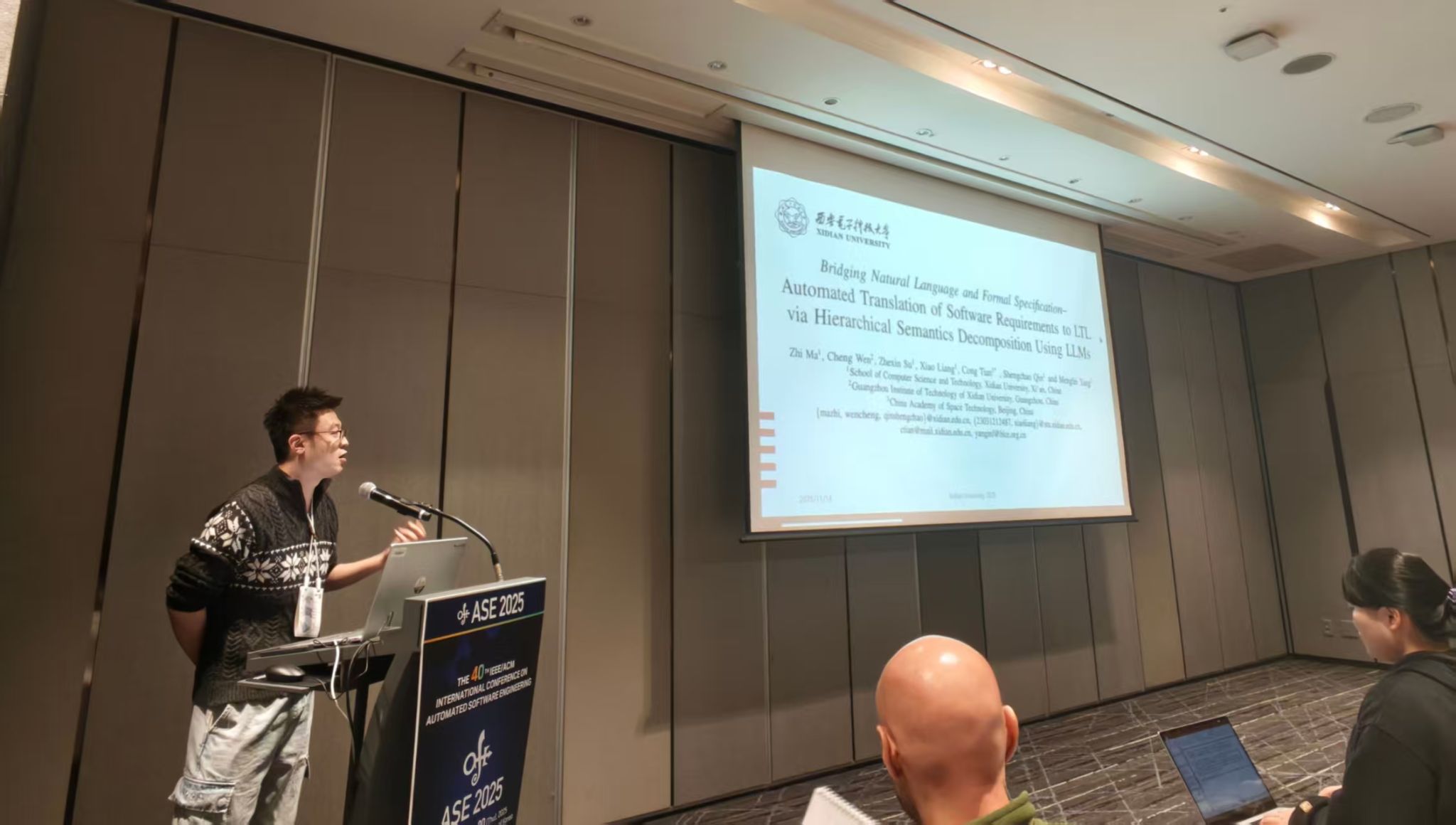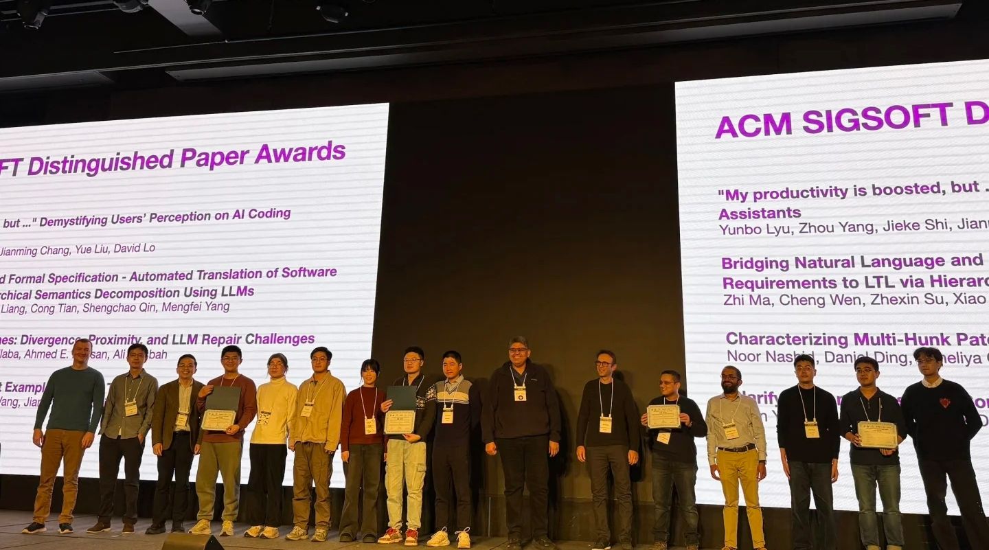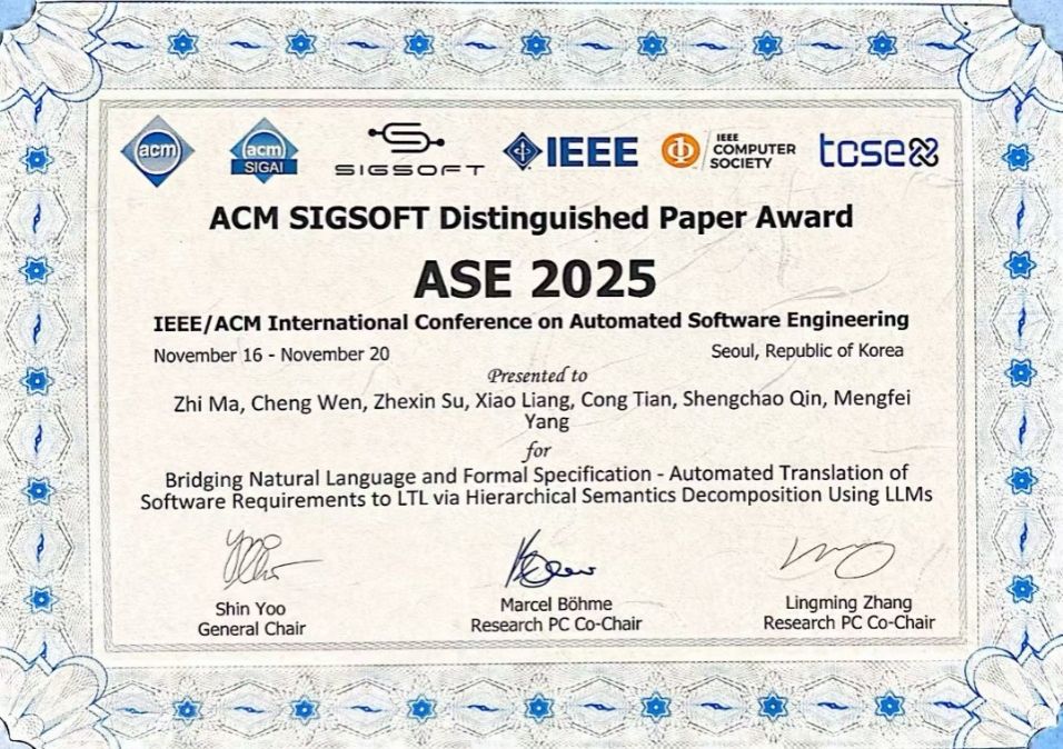 (通讯员 王小兵 常瀚堃)日前,第40届ASE2025(IEEE/ACM International Conference on Automated Software Engineering)国际学术会议在韩国首尔召开,ASE是国际软件工程领域的顶级学术会议,与ICSE、FSE并列为ACM SIGSOFT旗舰系列会议。西电365best体育官网登录田聪教授团队的工作“Bridging Natural Language and Formal Specification-Automated Translation of Software Requirements to LTL via Hierarchical Semantics Decomposition Using LLMs”获得IEEE/ACM SIGSOFT Distinguished Paper Award杰出论文奖,也是公司首次获得该项殊荣。该奖项是国际软件工程领域最具影响力的学术荣誉之一,用以表彰在理论创新与工程实践方面均有突出贡献的研究工作。本次论文由田聪教授担任通讯作者,杨孟飞院士为指导专家,论文第一作者为青年教师马智,其余作者依次为文成、苏哲欣、梁潇和秦胜潮教授。