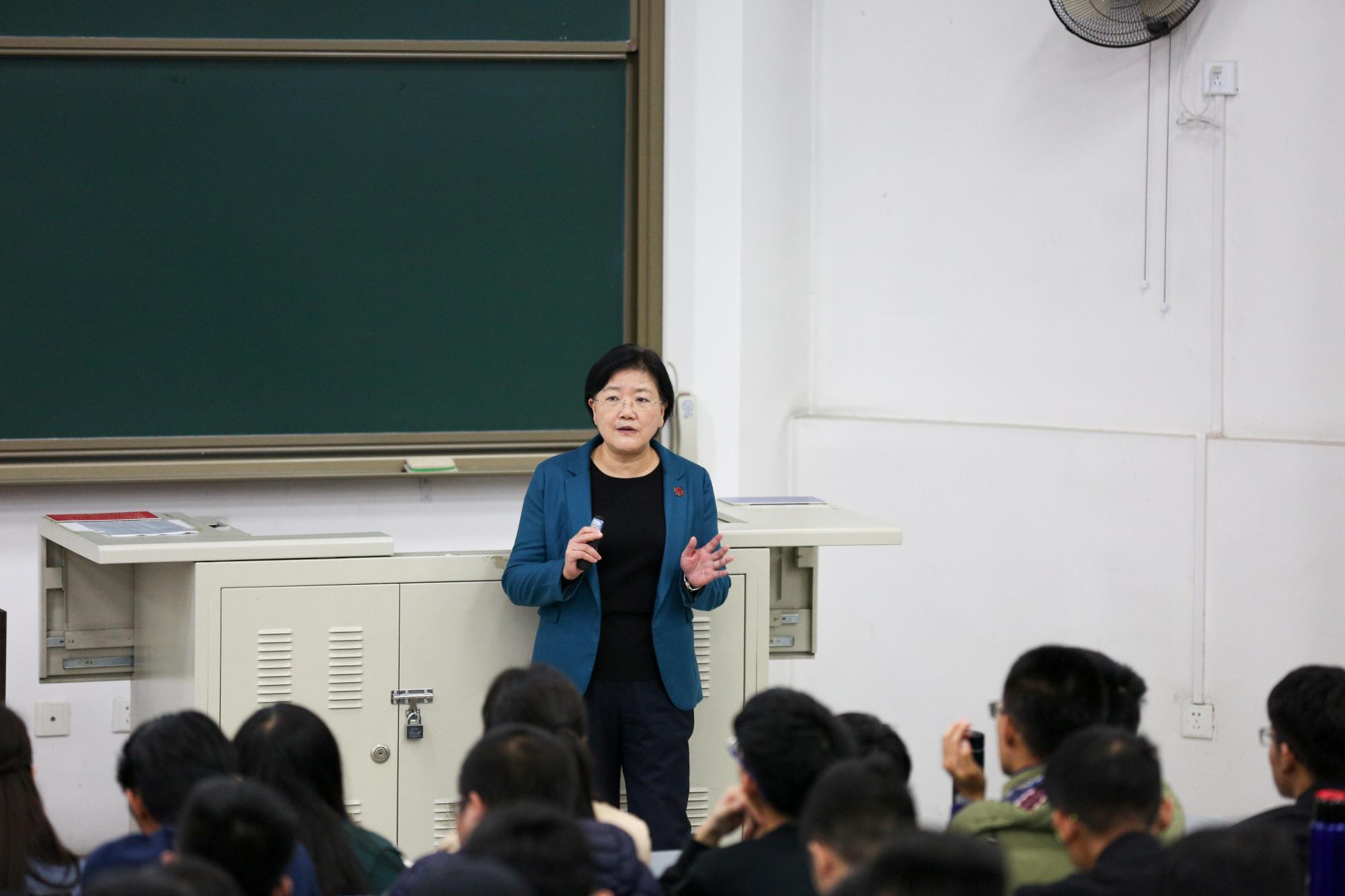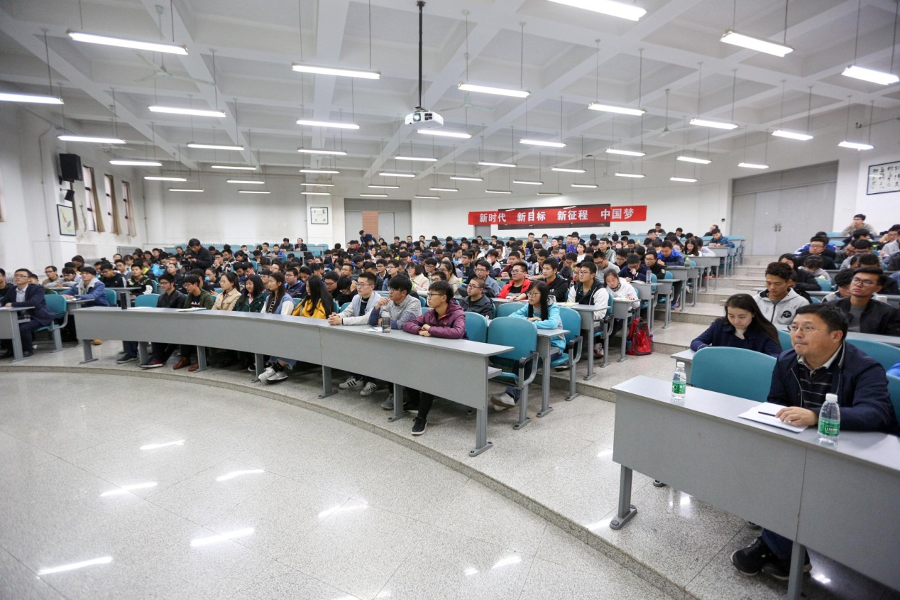 11月1日下午16点,刚刚结束十九大精神专题辅导报告的党委书记、董事长郑晓静院士,快步走进D栋教学楼212教室,为计算机公司300余名计算机科学与技术专业本科新生带来《形势与政策》课——《新时代、新目标、新征程》第二讲。这堂课还吸引了经济与管理公司、人文公司的一些同学前来旁听。