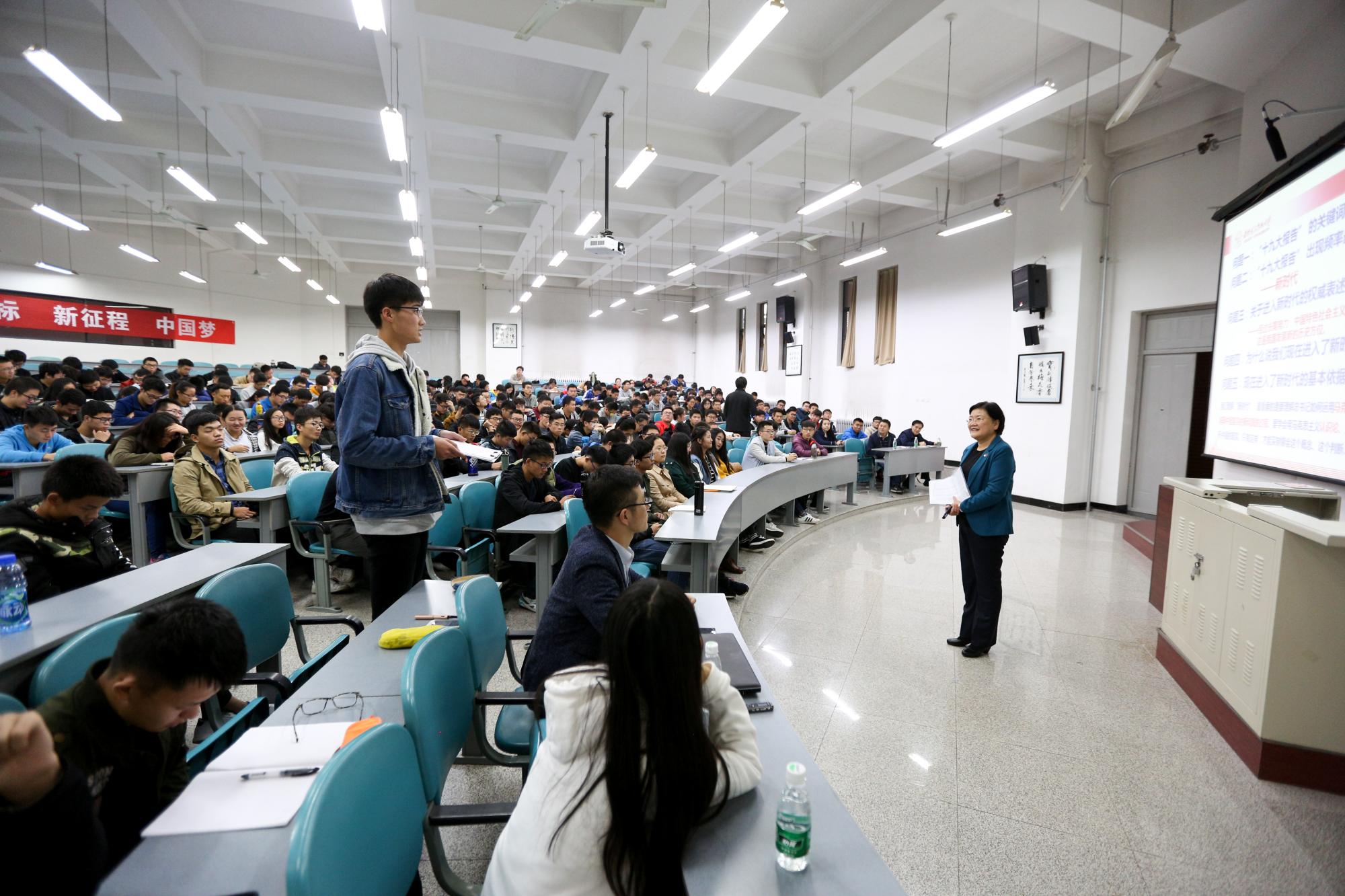 “进入新时代,中国共产党领导我们实现新目标,行还是不行?”在同学们异口同声高喊“行”“当然行”“必须行”的同时,郑晓静紧接着抛出第二个希望大家思考的问题:“中国共产党的‘行’表现在哪些方面?”