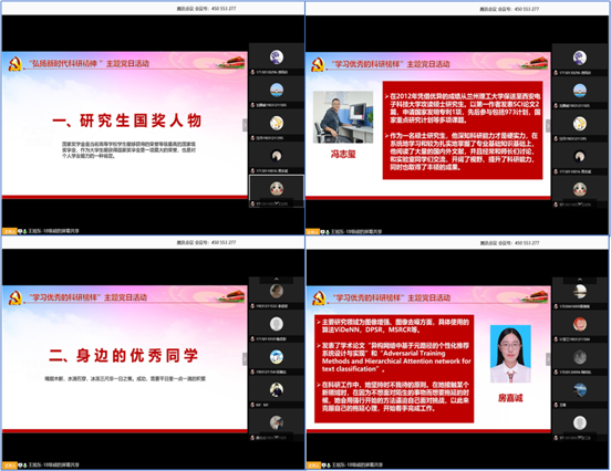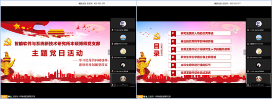 (通讯员 赵海洋)为激发本科生党员的科研热情,学习优秀研究生的科研精神和学习态度,积极响应把我国建设成为创新型国家和世界科技强国而努力奋斗的号召,365best体育官网登录智能软件与系统新技术研究所本硕博师联合党支部与辅导员张志为老师共同策划,于2020年4月24日组织召开了“学习优秀科研榜样,建设科技创新型国家”主题党日活动。本次活动由支部青年委员王旭东同志主持,活动共计120人参加,包括32名支部党员,88名17级本科生及入党积极分子。