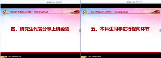之后,支部研究生党员代表分别分享了自己的保研、优研和考研的经历。曹壮同志和张薇薇同志提到语言表达能力和逻辑能力是保研面试的加分点;房嘉诚同志提到优研是很好的一个机会,但是不要让优研成为退路,下定决心考研就要全力以赴的备考;计亚江同志将自己考研经验进行了详细的阐述,分享了很多考研学习必备的书籍资料;张恒运同志提到考研不同于高考,考研更注重专业素养,大家要及时关注目标院校的报考政策和科目信息。