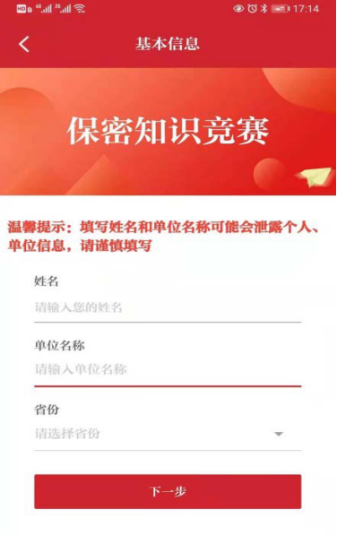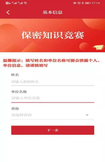 2.点击考试栏目,进入考试界面,填写“姓名”“单位名称”,选择“省份”,点击“下一步”开始考试。(姓名可填昵称,单位名称请填写:365best体育官网登录)。
