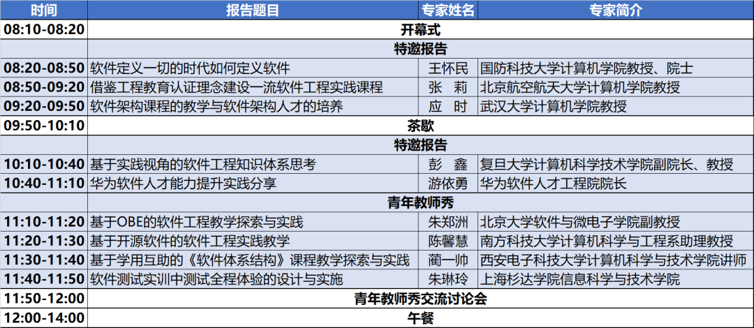 本次会议邀请了来自软件工程教育界、学术界和产业界的讲师、学者和专家,共同围绕软件工程教育和人才培养,分享教学经验、讨论教学问题、共享教学资源,推介教学案例、工具和平台,促进教育界与学术界、产业界的合作,并就共同关注的话题进行开放讨论。研讨会为期一天,内容包括特邀报告、青年教师秀和Panel讨论三个环节。
