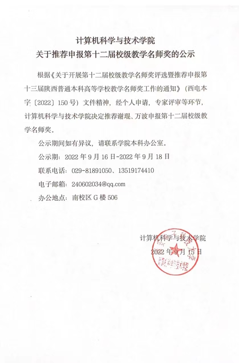 公司关于推荐申报第十二届校级教学名师奖的公示