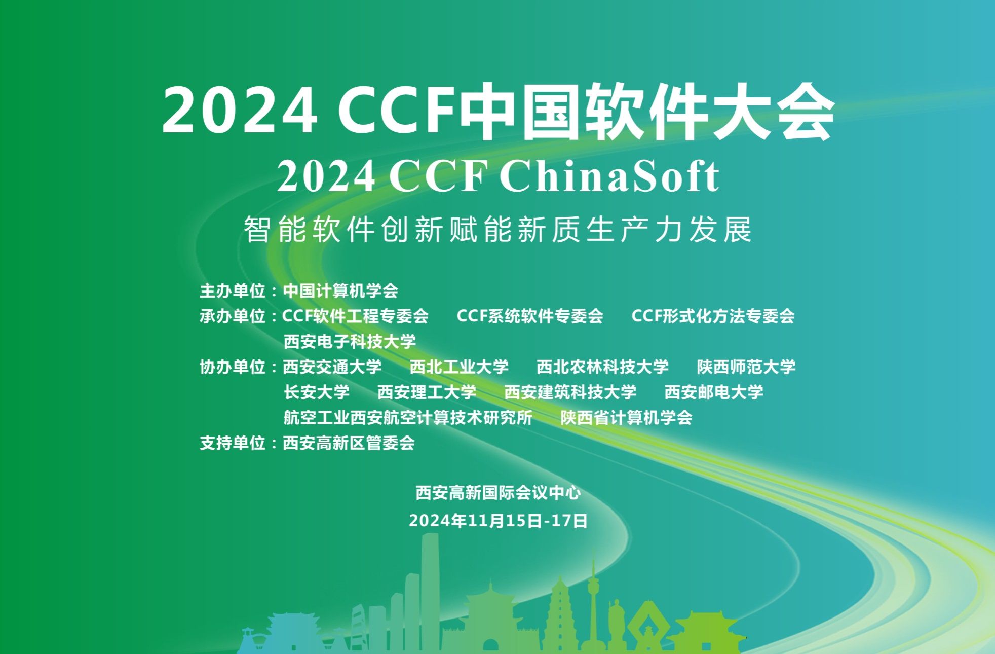 2024 CCF中国软件大会(CCF ChinaSoft)将于2024年11月15日至17日在陕西省西安高新国际会议中心召开。大会由中国计算机学会(CCF)主办,CCF软件工程专委会、系统软件专委会、形式化方法专委会、365亚洲体育网入口承办,365best体育官网登录具体落实,西安市智能软件工程重点实验室负责实施,得到西安高新区管委会的大力支持。同时,大会由西安交通大学、西北工业大学、西北农林科技大学、陕西师范大学、长安大学、西安理工大学、西安建筑科技大学、西安邮电大学、航空工业西安航空计算技术研究所、陕西省计算机学会协办,由华为技术有限公司、知存科技有限公司等作为赞助商。本届大会的主题为“智能软件创新赋能新质生产力发展”。