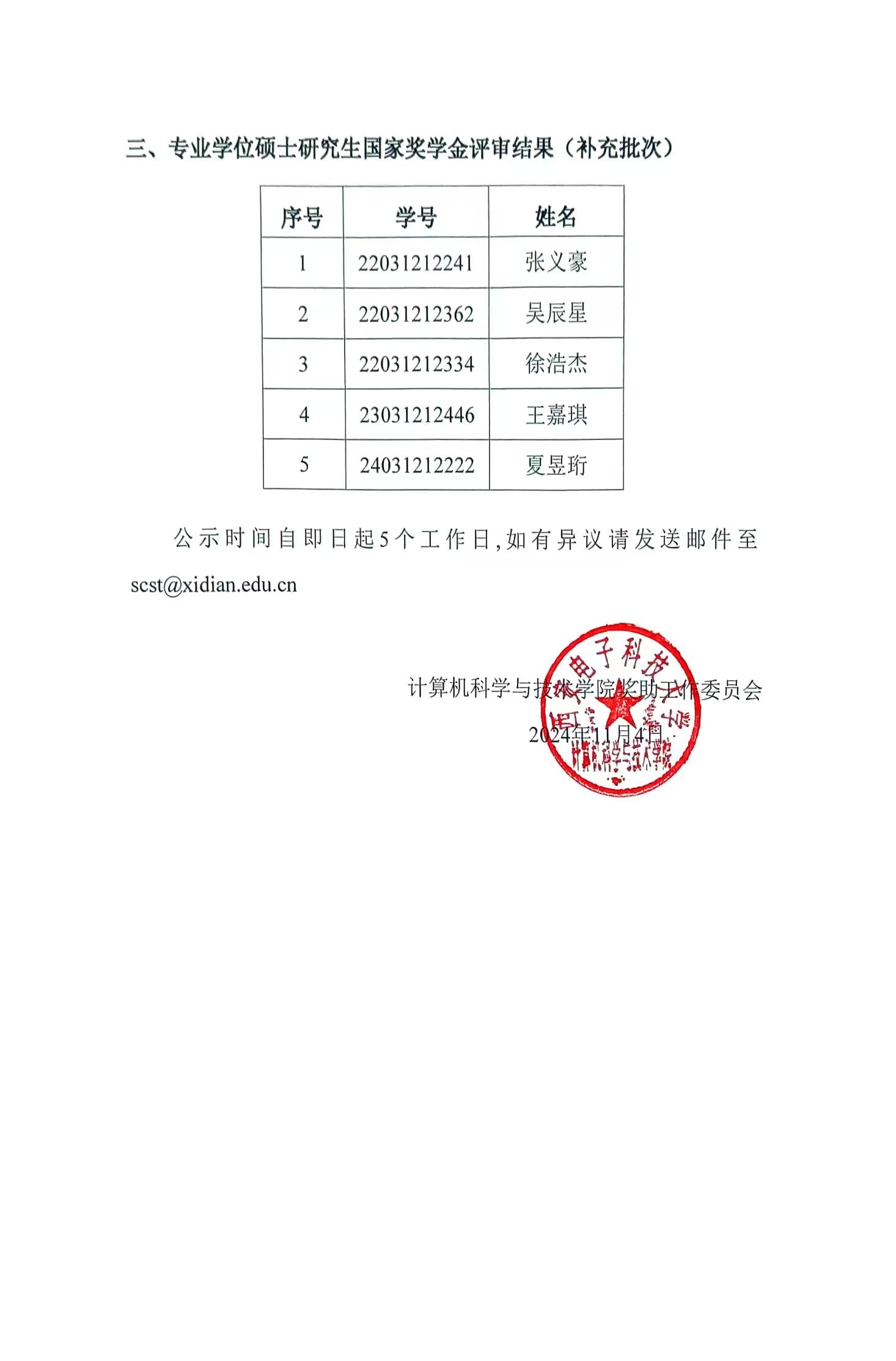 2024年研究生国家奖学金评审结果公示(补充批次)