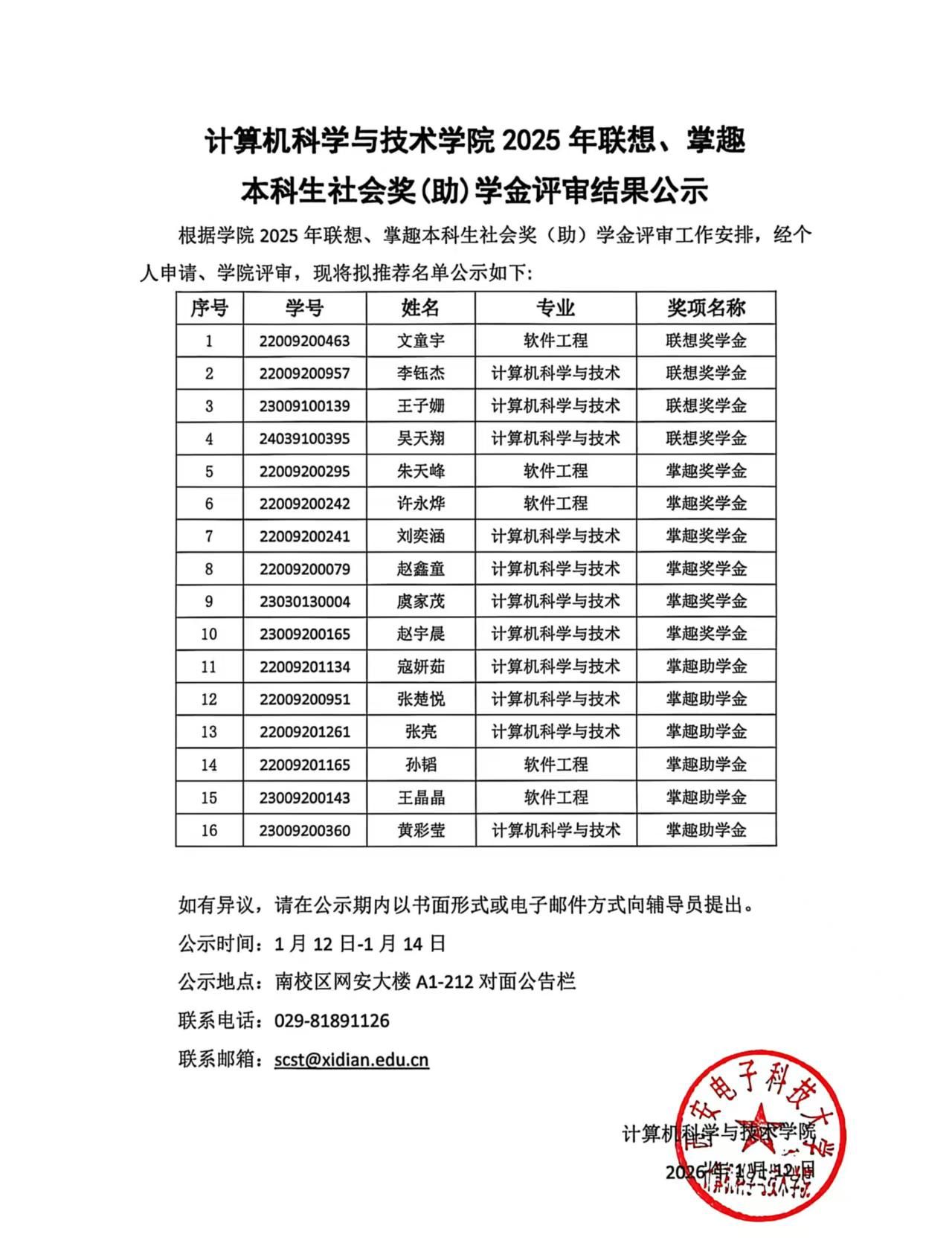 2025年联想、掌趣本科生社会奖(助)学金评审结果公示