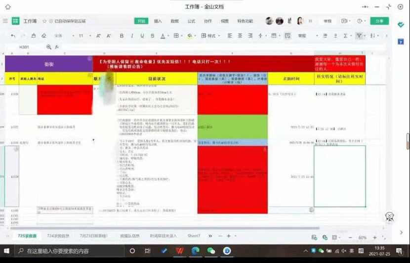 24日下午,我们的志愿者发展到5000人。我们将团队命名为“与豫”,在灾难面前,全国人民都和河南在一起!我们都是河南人!25日下午,河南情况好转,线上信息整理工作结束。截至7月25日下午16点,“与豫”志愿者团队人数达到8000余人,团队共计整合信息11227条,核实上报有效求救信息物资信息9000余条。