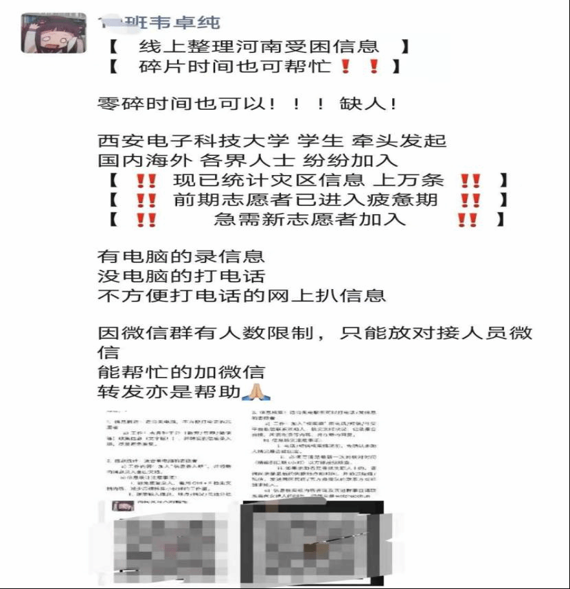 21日晚上,我开始进行志愿者的工作分流,郑州告急,在分流的时候,我意识到我们的人数远远不够,而我因为平时性格比较外向,QQ和微信的好友比较多,我立即想到动员身边的同学,我开始发朋友圈,发QQ空间志愿者招募信息,那时候的标题是“线上整理河南受灾信息,我们需要你!”