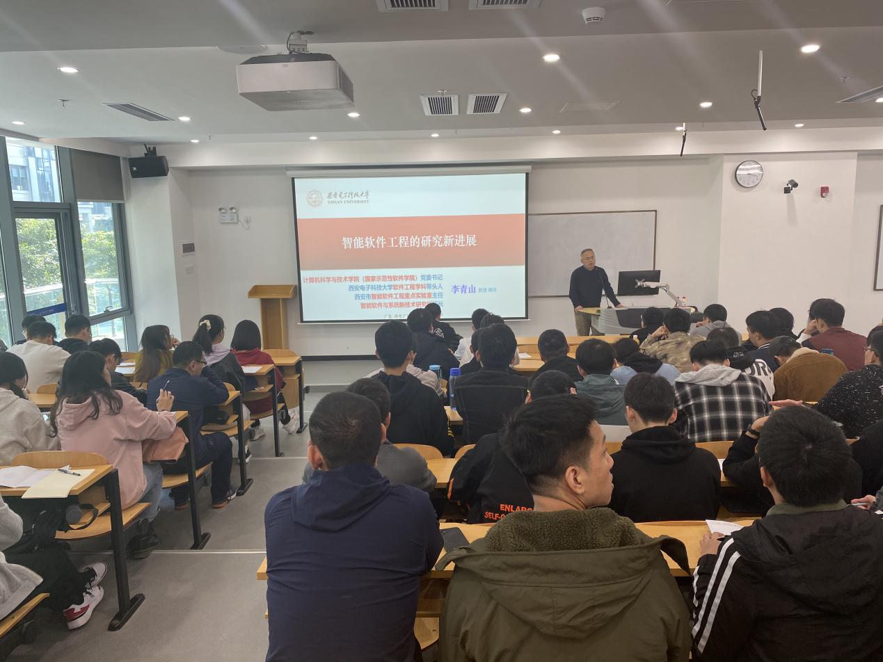 座谈会后,李青山书记作为西电软件工程学科带头人、西安市智能软件工作重点实验室主任、智能软件与系统新技术研究所所长,受邀向广研院的230余名全体研究生在黄埔区海丝知识中心B5栋205教室作了题为“智能软件工程的研究新进展”的学术报告,报告从智能软件工程的技术与产业应用的角度,对学术研究与产业应用进行了全面阐述。广州研究院执行经理沈八中、党委副书记刘涛以及相关教师一起聆听了讲座。