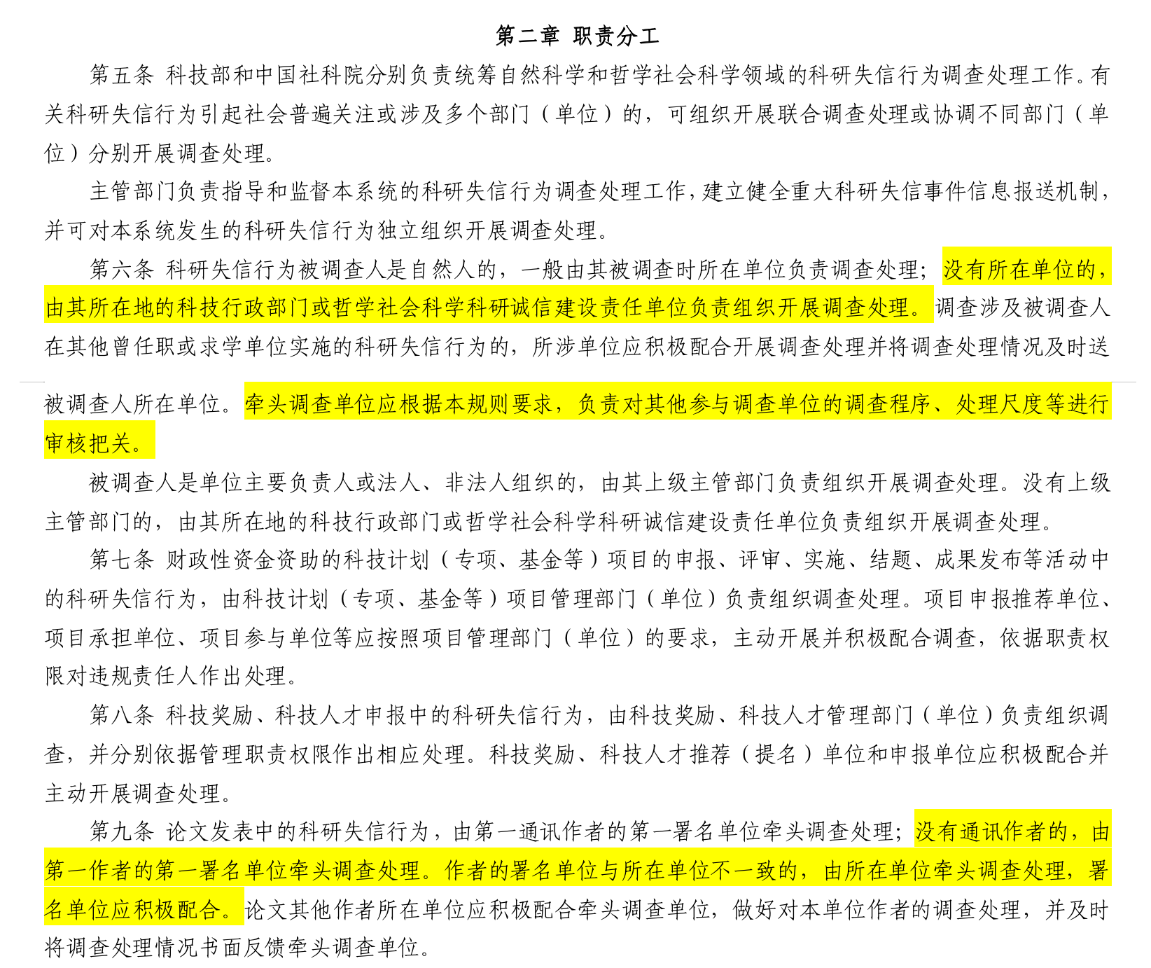 《规则》进一步细化了调查处理职责分工,明确了科技部等22个部门对科研诚信问题的职责分工处理,将工作细化落实到各个部门各个单位,目的不在处理而是重在引导,单位之间互相配合处理工作,监督落实实施政策。