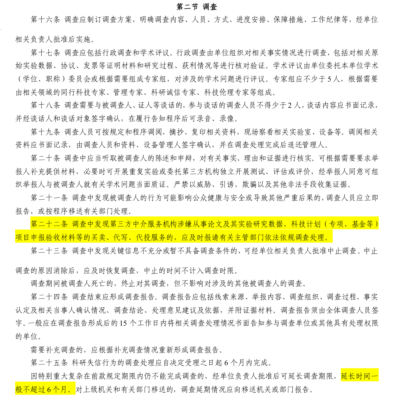 调查中新增条目为第二十二条,对于调查中发现第三方中介服务机构涉嫌从事论文及其实验研究数据、科技计划(专项、基金等)项目申报验收材料等的买卖、代写、代投服务的情况,应及时报请有关主管部门依法依规调查处理。本节中最后一条科研失信行为的调查处理由延长时间最长不得超过一年修订为不超过六个月。