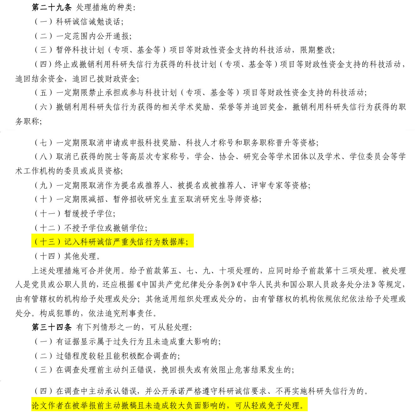 新《规则》第四章处理中第二十九条,将“记入科研诚信严重失信行为数据库”单列为处理措施,并一步细化了调查处理职责分工。第三十四条新增内容为“论文作者在被举报前主动撤稿且未造成较大负面影响的,可从轻或免予处理”。