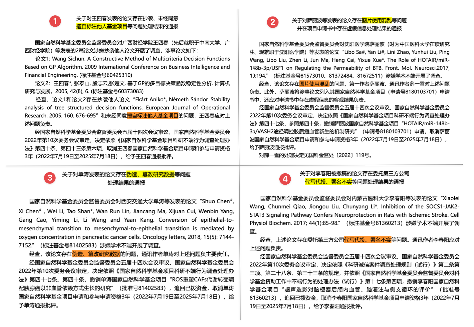 国家自然科学基金委员会2022年查处的不端行为案件处理结果通报(第三批次)中就出现以上科研失信行为,经过调查后均进行了相应处理。