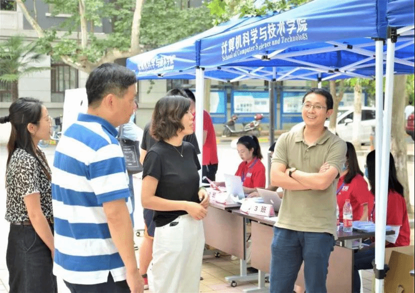 9月13日,北校区主楼下步行街研究生报到接待点,迎新志愿者们早早就开始了准备工作,搭设帐篷、摆放桌椅、分配物资。研究生迎新现场设立了六个工作台,志愿者分工合作,服务不同班级的新生,检查报道材料、登记信息、发放物资、一卡通、介绍校园、组建班群等等,各项工作井然有序。