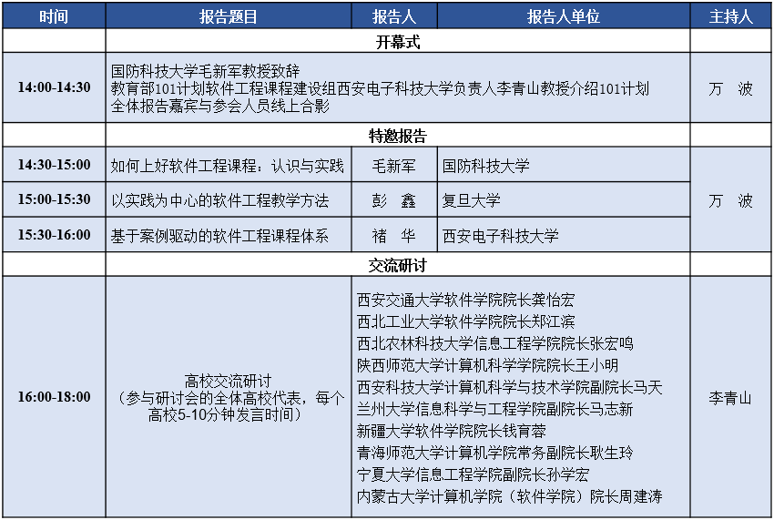 本次西北地区高校软件工程课程建设研讨会,邀请国防科技大学、复旦大学、365亚洲体育网入口、西安交通大学、西北工业大学、西北农林科技大学、陕西师范大学、西安科技大学、兰州大学、宁夏大学、青海师范大学、新疆大学、内蒙古大学等西北地区高校,通过特邀报告、交流沙龙等形式,交流软件工程课程教学和教改的成果,分享软件工程课程教学资源,商讨软件工程课程教学中遇到的各类困难和问题,提升软件工程课程建设水平。