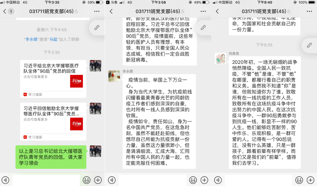 3月15日,习近平总书记给北京大学援鄂医疗队全体“90后”党员回信,向他们和奋斗在疫情防控各条战线上的广大青年,致以诚挚的问候。回信在广大青年员工,特别是党员中引起热烈反响。3月18日下午,365best体育官网登录硕士031711班第一、二党支部举办了线上主题党日活动,围绕“学习习近平总书记回信精神,绽放青春绚丽之花”主题,认真学习回信精神,展开热烈讨论。