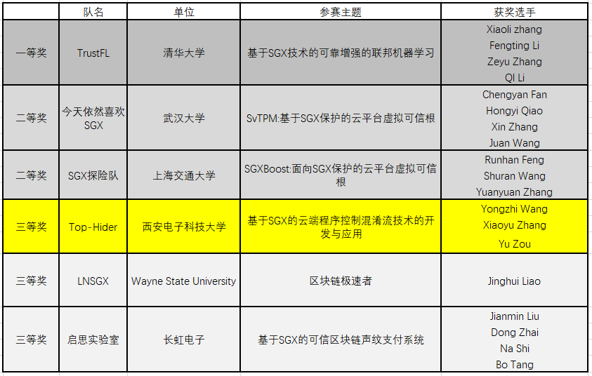 (通讯员 邹宇)11月18日至11月20日,由阿里云、浙江大学网络空间安全公司、阿里巴巴-浙江大学前沿技术联合研究中心联合发起、Intel赞助支持的首届SGX应用创意大赛在杭州IEEE IDSC上举行。来自清华大学、北京大学、上海交通大学、365亚洲体育网入口、长虹电子等知名高等院校团队和企业的87支队伍参加了这次比赛,争夺共6个获奖名额,获奖比率小至6.89% 。最终,公司365best体育官网登录NSS团队的代表队,TOP-HIDER的参赛作品“基于SGX的云端程序控制流混淆技术的开发与应用”在比赛中脱颖而出,获得三等奖,成为唯一获奖的西部高校。该参赛作品由王永智副教授指导,由硕士生邹宇、张小宇完成。
