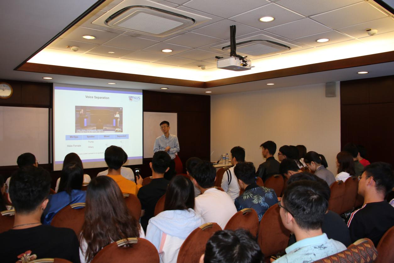 1月22日下午,不顾旅途劳累,同学们来到了新加坡科技研究局(Agency for Science, Technology and Research, A*STAR),由新加坡科技研究局资讯通信研究院高级科学家Dong Minghui博士先向同学们介绍了A*STAR的各个部门,包括BMRC、JCO、SERC和ETPL以及SERC等的研究方向,随后董博士给同学们做了“Speech Processing Platform:AcousticModel,Lecxical,Machine Translation, Dialogue Technology, Meeting Recognition and Summarization”的报告,深入浅出地介绍了智能语音交互技术、机器翻译技术、自动对话技术和自动会议语音识别与摘要技术及其发展现状与实际应用。董博士团队的孙研究员以Employee Analytics为例,演示了团队大数据分析的成果,使同学们对机器学习和深度学习有了初步的概念,对智能语音处理技术产生了极大的兴趣。