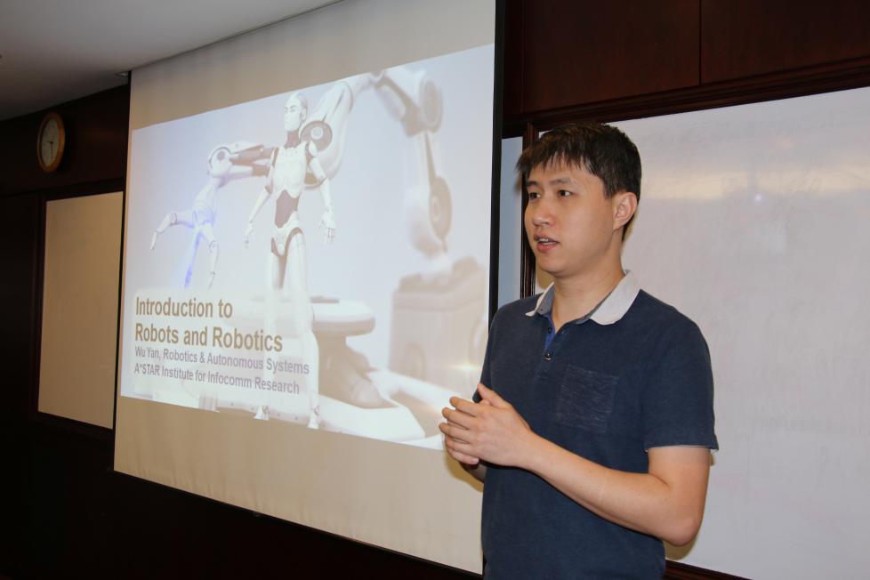 28日上午,新加坡科技研究局的吴龑博士给同学们做了“Introduction to Robots and Robotics”的报告,带领大家走进机器人的世界。吴博士从“机器人是什么”这一根源性的问题出发,结合机器人和机器学的发展历史,循循善诱,带领同学们随着时间溯流而上,探究机器人的奇幻世界。回首过去,展望未来,吴博士联系当下机器学习的热点话题,在反应学习行为和适应学习行为两方面,层层剖析,系统讲解机器学习的核心工作体系。将同学们带入了机器人未来的世界。