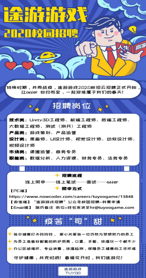1、统招2020届本科/研究生(同时招2021届实习生),计算机相关专业,热爱游戏行业,有项目实习经验优先;