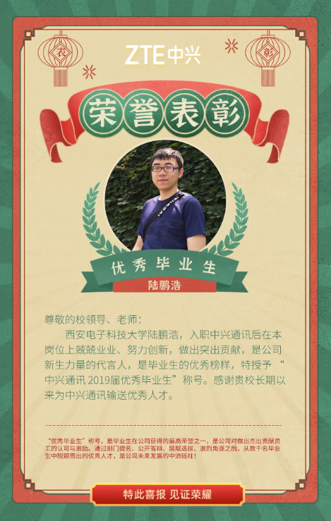 (通讯员 同榛)近日,公司收到中兴通讯股份有限公司人力资源部发来的喜报:在刚刚结束的中兴通讯2019届优秀毕业生评选中,2019届软件工程专业硕士毕业生陆鹏浩荣获中兴通讯2019届优秀毕业生称号。