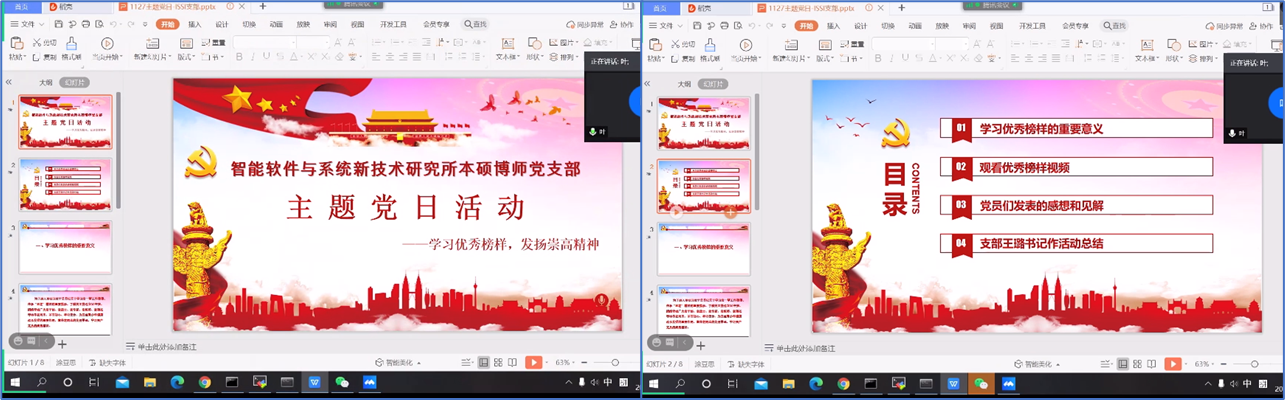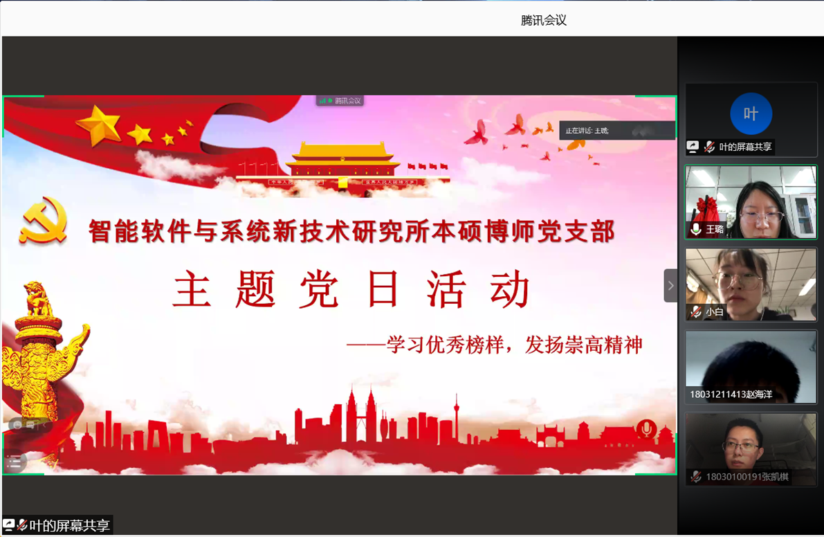 (通讯员 张凯琪)为了深入贯彻习近平总书记关于学习老一辈工作楷模、传承“五老”精神的重要指示,学习和发扬老一辈优秀榜样的崇高精神,365best体育官网登录智能软件与系统新技术研究所本硕博师联合党支部于2020年11月27日下午开展了“学习优秀榜样,发扬崇高精神”主题党日活动。活动由支部青年委员叶国强同志主持,共计47人参加,采用腾讯会议线上召开的方式进行。