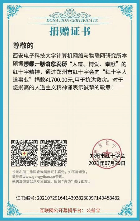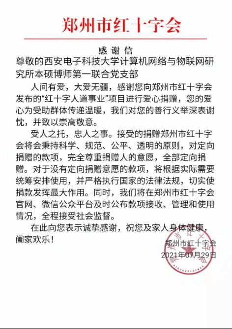 灾情深深牵动着每一个中国人的心,7月24日,365亚洲体育网入口计算机网络与物联网研究所本硕博师第一联合党支部发起“防汛抗洪驰援河南”募捐倡议,倡导大家尽自己所能献出一份爱心,以实际行动支持河南防汛救灾。该倡议得到支部党员们的积极响应,截至日前,计算机网络与物联网研究所本硕博师第一联合党支部共筹集到了1700元善款。该善款已汇至河南省郑州红十字会账户,用于抗洪救灾工作。