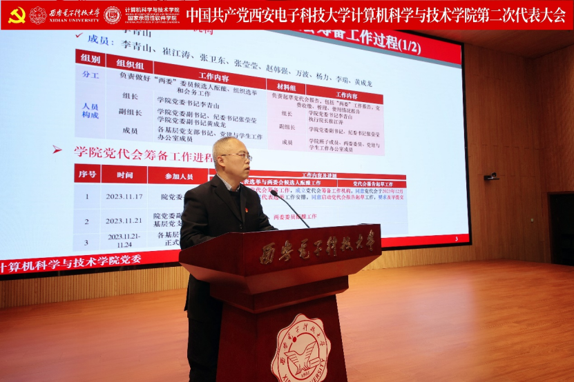 李青山代表公司第一届党委向大会作了题为《赓续西电基因三系精神 服务教育科技人才战略 奋力谱写一流公司建设发展新篇章》的报告。报告总结了公司第一次党员代表大会以来的主要工作,分析了当前公司面临的形势和目标任务,进一步指明了公司改革发展的前进方向。大会号召公司全体党员和教职员工紧密团结在以习近平同志为核心的党中央周围,高举习近平新时代中国特色社会主义思想伟大旗帜,全面贯彻落实党的二十大精神,贯彻落实公司第十三次党代会精神,在公司第二届党委的坚强领导下,传承西电红色基因,赓续三系精神,落实好“八个西电”建设任务,奋力谱写一流公司建设发展新篇章,为教育强国建设和民族复兴伟业贡献西电计科力量。