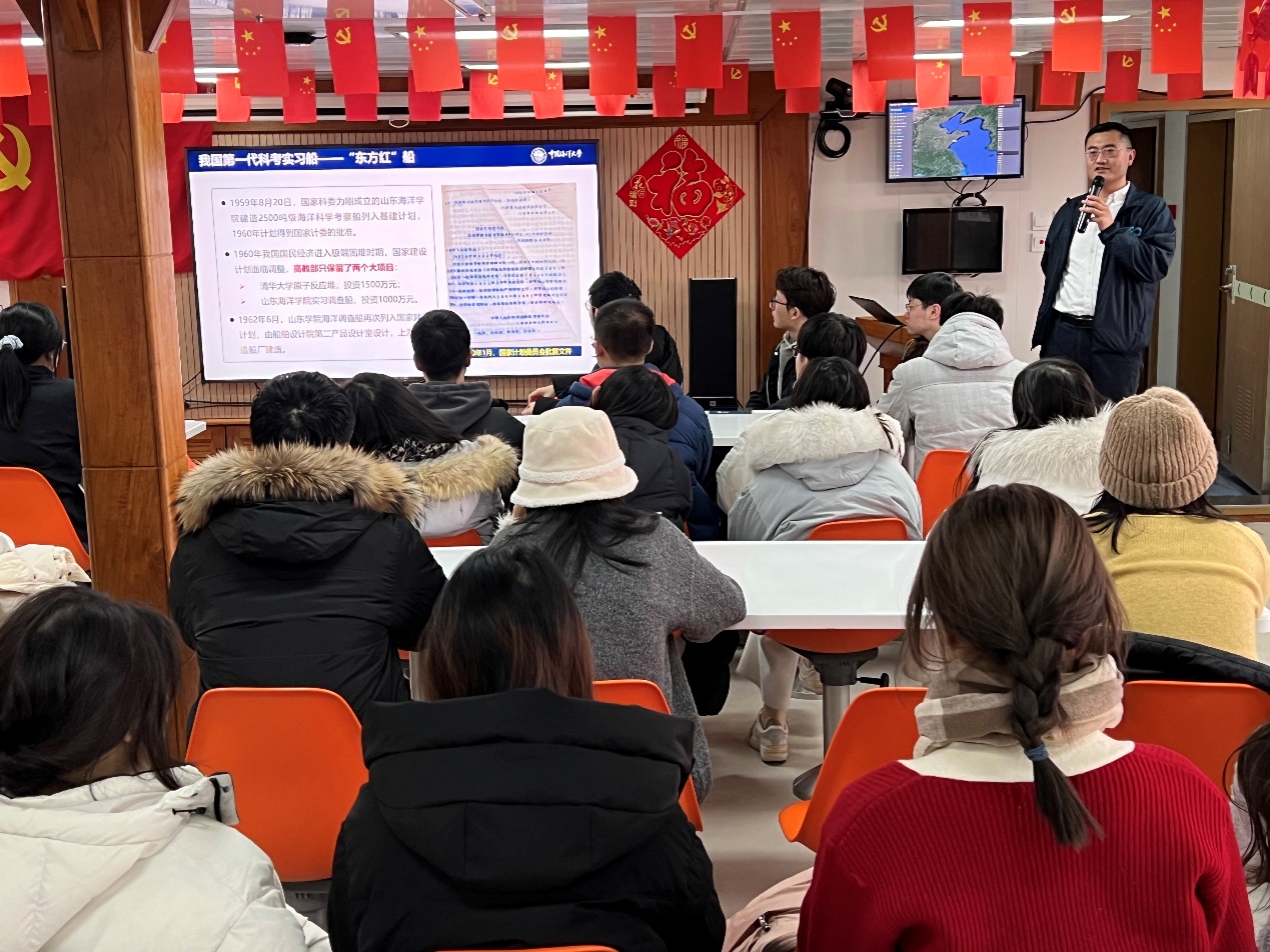 在行进的“东方红3”船上,中国海洋大学船舶中心主任王毅以《东方红科考实习船的前世今生》为题开讲,详细介绍了我国立足国家海洋强国战略自主研发“东方红3”船的历史,回顾了中国海洋大学“东方红”海洋综合科考实习船自1965年投入使用以来以为国家海洋人才培养和海洋科考事业为己任,历经三代变迁和发展的历程,解读了“不畏艰险、敢为人先”的“东方红”精神。