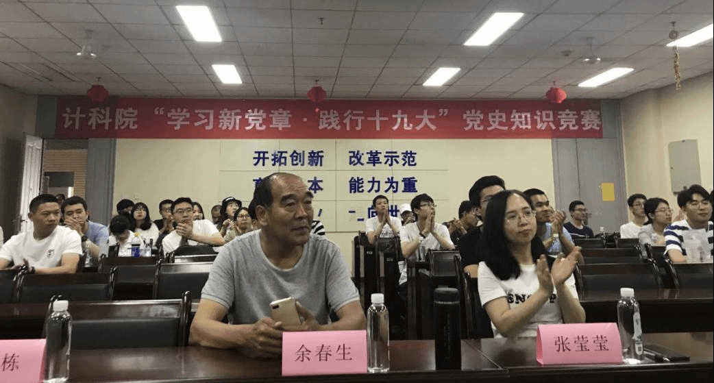本次知识竞赛由三个环节组成,分别是必答题、抢答题和风险题,题目内容涉及习近平新时代中国特色社会主义思想,党史、党章、党的十九大精神等。第一环节为车轮战,各代表队平分秋色,第一轮各队都以满分晋级。第二环节比赛现场抢答如火如荼,各参赛队反应迅速,竞相展现党的知识积累,各队成绩逐步拉开距离。最后的风险题环节,有的队伍选择保守稳进,有的则乘胜追击,将比赛一次次推向高潮。