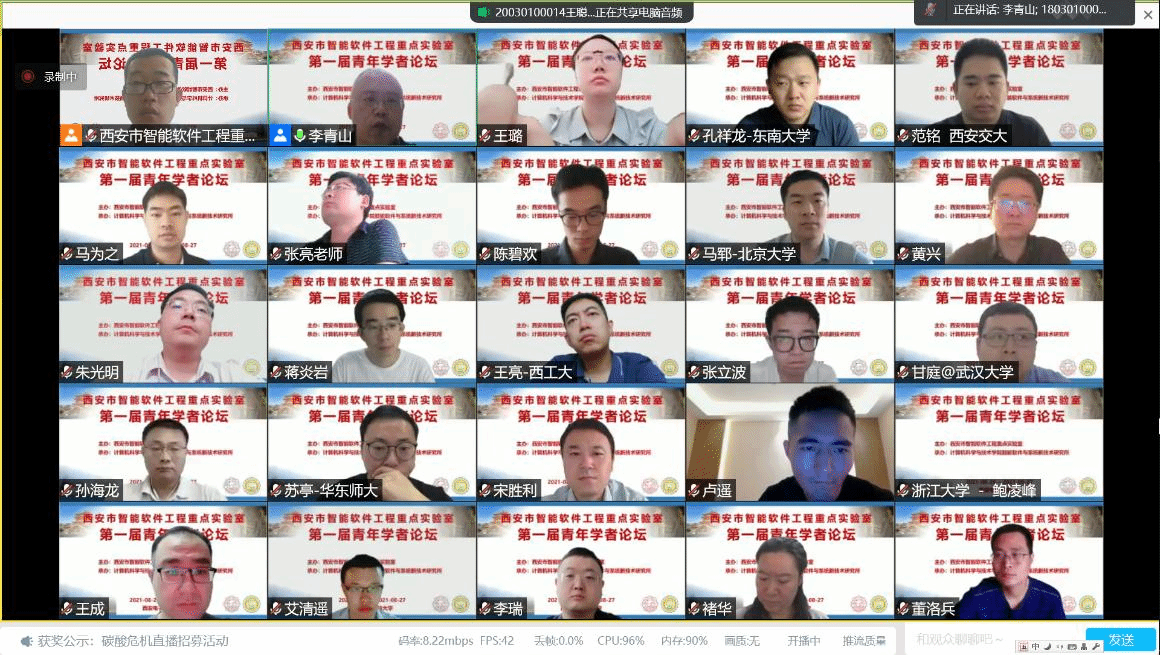 (通讯员 徐悦甡)2021年8月26日至8月27日,365亚洲体育网入口西安市智能软件工程重点实验室第一届青年学者论坛成功举办。本次论坛由365best体育官网登录智能软件与系统新技术研究所承办,采用腾讯会议与在线直播两种方式线上进行。论坛围绕智能软件与智能系统领域最新学术进展,邀请了清华大学、北京大学、南京大学、复旦大学、浙江大学、国防科技大学、北京航空航天大学、中科院软件所、东南大学、华东师范大学、武汉大学、同济大学、北京理工大学、西安交通大学、西北工业大学、365亚洲体育网入口、美国犹他大学、德国慕尼黑工业大学等国内外软件工程学科优势高校的20位软件工程相关领域优秀青年学者,通过主题报告、交流沙龙等形式,分享了智能软件与智能系统领域的理论与技术新进展,讨论了相关领域的学术前沿,并就公司软件工程学科的建设与发展进行了交流。论坛吸引了国内外软件工程相关领域师生与从业人员的广泛参与,腾讯会议室同时在线人数超过700人,B站在线直播同时观看人数超过2000人。
