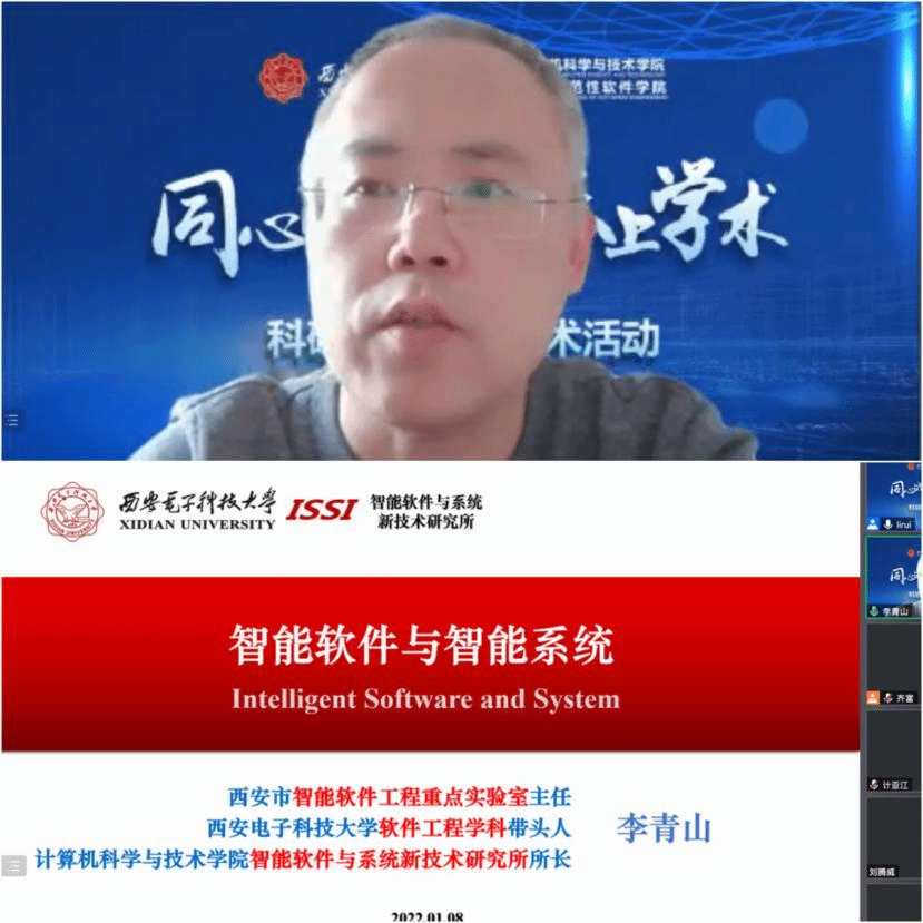 李青山教授以智能软件与智能系统为主题作报告。他首先介绍了智能软件与系统新技术研究所的成立背景、团队队伍、团队布局、研究方向以及研究所建设成效,涉及科研攻关、产教融合、学术交流、创新创业和校企合作等方面。接着,他重点介绍了研究所在智能软件工程、认知计算理论与智能交互技术、智能感知与人机交互和基于无源感知的智能系统等四个研究方向开展的科学研究和学术成果。最后,他展望了研究所未来研究方向,并鼓励同学们在学习中开阔视野,面向国家需求,结合项目实战,提升软件研发综合素养和科研能力。