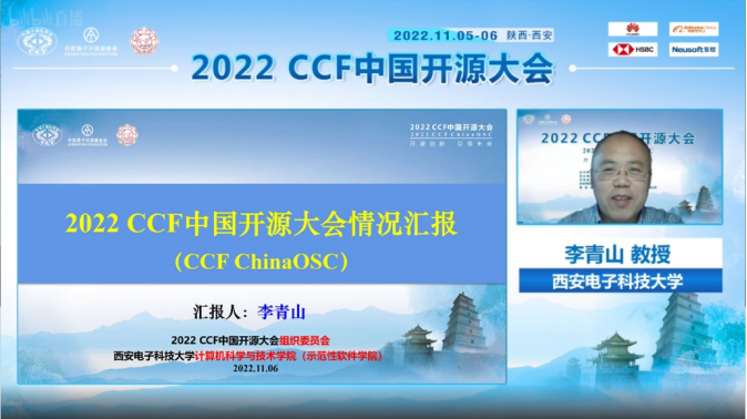 大会程序委员会与组织委员会联合主席、365亚洲体育网入口软件工程学科负责人、陕西省智能软件工程创新团队负责人、西安市智能软件工程重点实验室主任李青山代表大会组委会向与会代表汇报了大会情况。李青山主要从大会基本情况与大会筹办工作两个方面对大会进行了总结,归纳了会议体系与会议内容,指出本届大会的论坛数量、注册人数与合作媒体数量等均超过预期。其中论坛数量达到24个,注册人数达到180人,合作媒体数量超过10家。11月5日各平台累计观看人数超过18万人,11月6日累计观看人数超过16万人,两天会期累计观看人数超过34万人,单个论坛平均访问量超过1万人次,最大访问量超过2.1万人,有利的扩大了大会影响,有效的传播了开源理念。进一步,李青山梳理了大会筹办的脉络,表示开源发展委员会与承办团队一同组成了大会组委会,持续密切协同,先后确定了支持单位与四家赞助商,构建了完善的会议联办体系。组委会持续通过多家单位的多种渠道对大会进行宣传,会议通知等的阅读量累计超过3万人次。面对疫情等因素的影响,组委会全程关注、及时调整、稳步推进,全力保障会议质量。最后,李青山感谢各位专家学者与师生同行对本次大会的关注和参与,也感谢各参与单位对于大会的支持。