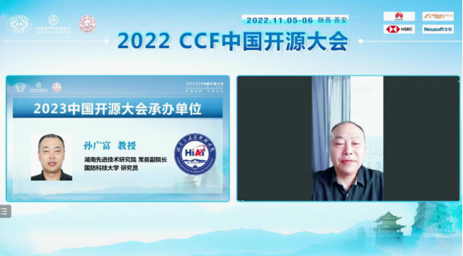 随后,大会举办了下届会议的承办交接仪式,第二届CCF中国开源大会将由湖南先进技术研究院承办,常务副经理孙广富教授代表承办单位参加交接仪式,对湖南先进技术研究院进行了介绍,并表示感谢开源发展委员会的信任,会向本届大会承办单位取经,同时会与开源发展委员会密切协同,力争为开源领域的广大师生同行再次呈现一次精彩的大会。
