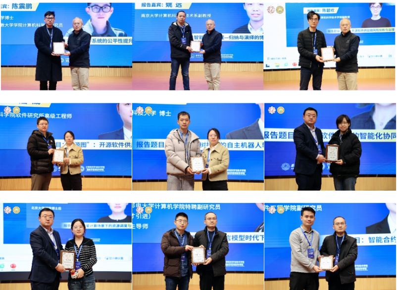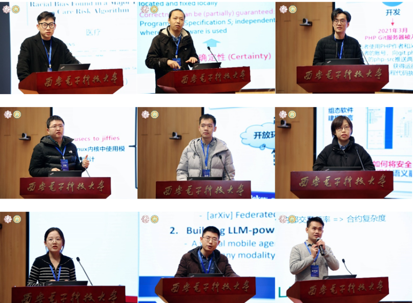 青年学者研讨会由李青山教授、李瑞教授,西安市智能软件工程重点实验室副主任王璐副教授以及计算理论与技术研究所副所长王小兵副教授主持。来自北京大学与英国伦敦大学公司的陈震鹏博士,南京大学姚远副教授,复旦大学陈碧欢副教授,中科院软件所屈晟高级工程师,国防科技大学杨硕博士,北京航空航天大学葛宁副教授,北京大学李晴博士,北京邮电大学徐梦炜博士,中山大学郑沛霖博士分别围绕智能软件系统的公平性提升、智能软件工程中的归纳与演绎的博弈与协同、开源软件供应链风险分析与治理、开源软件供应链安全实践、自主机器人软件开发方法、领域软件系统的智能化协同建模、卫星计算场景下的资源调度与优化、大语言模型时代下的边缘智能系统以及智能合约缺陷检测等主题带来了精彩的报告。
