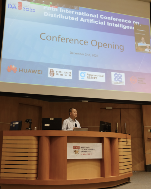 (通讯员 徐悦甡)2023年11月30日至2023年12月3日人工智能领域知名国际会议DAI 2023(Distributed Artificial Intelligence Conference,国际分布式人工智能会议)在新加坡成功举办,会议围绕通用人工智能、多智能体系统、软件工程与人工智能、计算博弈论等主题展开研讨。作为一届人工智能领域高水平的国际盛会,大会邀请了Milind Tambe(哈佛大学Gordon McKay计算机科学教授、谷歌研究院AIfor Social Good主任、AAAI/ACM Fellow),Yuhuai (Tony) Wu(xAI联合创始人),Carla P. Gomes(康奈尔大学Ronald C.and Antonia V.Nielsen计算和信息科学教授、计算可持续性研究所主任, AAAI/ACM Fellow),Joseph Sung(南洋理工大学高级副董事长、中国工程院院士,前香港中文大学董事长)做特邀报告,并组织了6大主题的顶会级别的会议报告和多个聚焦前沿性研究的学术沙龙。大会由南洋理工大学安波教授、德克萨斯大学奥斯汀分校Peter Stone教授共同担任大会主席。