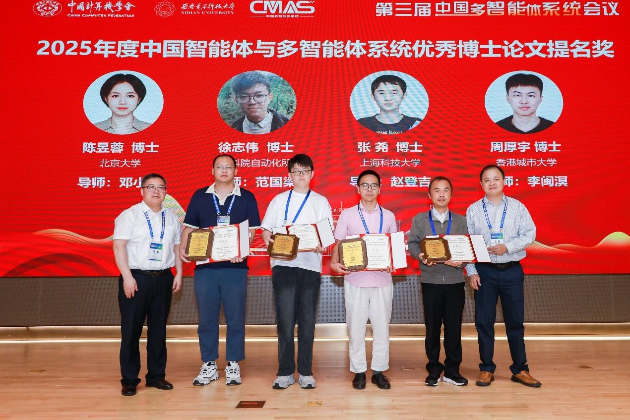 最后颁发中国智能体与多智能体系统优秀博士论文提名奖(2025),获奖人员包括北京大学陈昱蓉博士、中国科公司自动化所徐志伟博士、上海科技大学张尧博士、香港城市大学周厚宇博士。