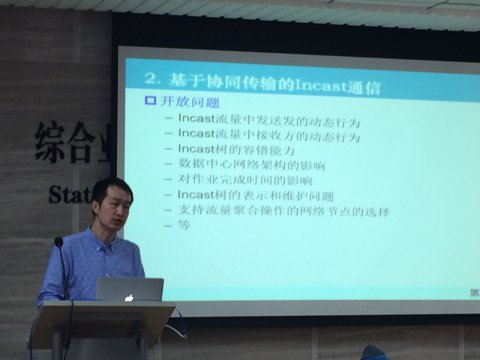 郭老师首先介绍了近年来数据中心新型体系结构设计方法方面的演变和发展趋势,即以服务器为核心的数据中心、以交换机为核心的数据中心、模块化数据中心、随机拓补的数据中心以及无线数据中心。随后,他就数据中心内关联性流量IncastShuffleMulticast的网内聚合效应进行讨论,重点介绍了他在该领域的最新研究成果,即如何通过关联性流量的协同传输最大化这些流量的网内聚合增益,降低数据中心内庞大的东西向流量对网络带宽的消耗。
