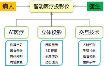 AI医疗采用机器学习对人体器官分类和对病体进行自动分割;裸眼立体投影技术把分类和分割的结果以立体投影、全息动态渲染的方式显示在病人和医生的面前;交互技术采用人脸识别、手势控制、语音控制的技术对立体投影进行虚拟操作和标注。